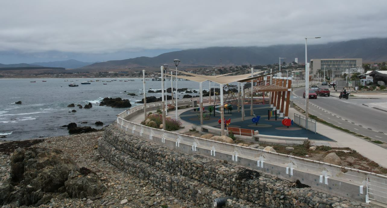 Diseño Mejoramiento borde costero SOCOS-TONGOY - REGIÓN DE COQUIMBO: Se realizó además topografía, batimetría, calicatas, sondajes marítimos, estudio de situación legal de terrenos, estudio territorial, análisis hidráulico del estero Tongoy, estudio de oleaje, y la arquitectura e ingeniería y proyecto de especialidades de detalles del borde costero de Socos. Considera trabajos de Participación Ciudadana con la comunidad.